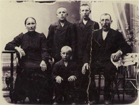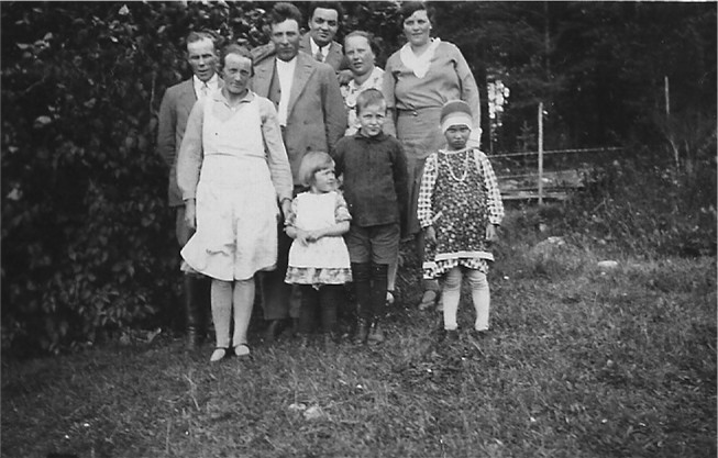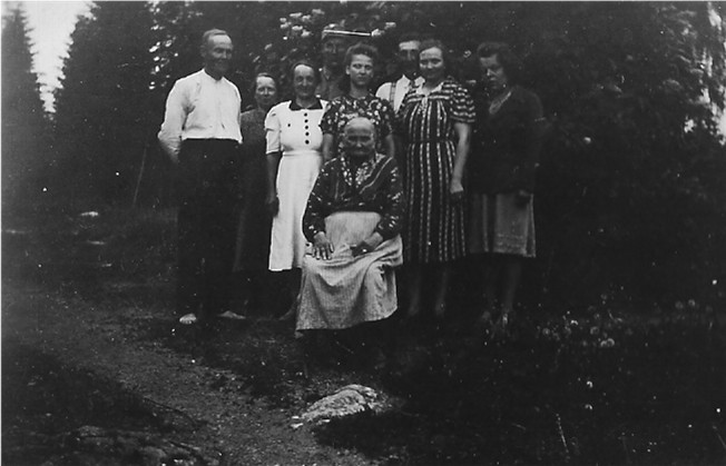 Seuraavan kuvan henkilöt ovat vasemmalta: Väinö, vähän taaempana Rosenbergin Teutorin vaimo, Lempi, aivan takana juuri ja juuri näkyvä sotilas on ilmeisesti Kauko, Kivimäen Aino, Arvo Ahvenoja, Arvon vaimo Kivimäen Lempi ja aivan oikealla Hyökyniemen Helmi. Edessä istuva Kivimäen mummu mehän jo tunnetaankin.